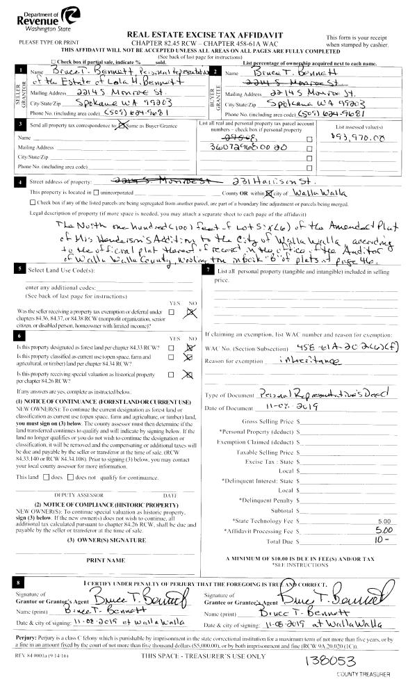 | 6 | 11/08/2019 | DPR | DEED OF PERSONAL REPRESENTATIVE | BENNETT LOLA HOYT | BENNETT BRUCE T | | | $0.00 | 138053 | 2019-09214 |