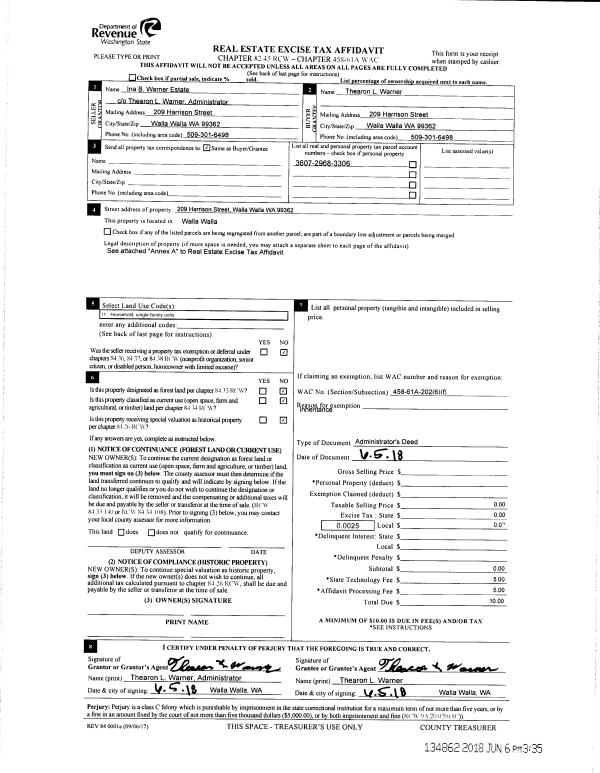 | 2 | 06/05/2018 | ADMD | ADMINISTRATOR'S DEED | WARNER INA | WARNER THEARON L | | | $0.00 | 134862 | 2018-04530 |