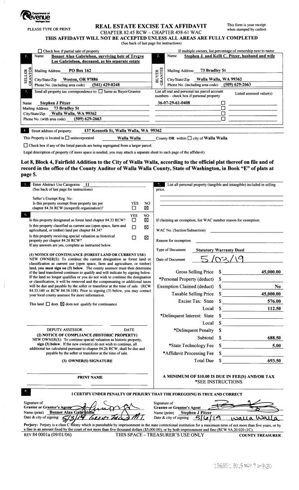 | 1 | 05/07/2019 | SWD | STATUTORY WARRANTY DEED | GABRIELSON BENNET ALAN | PITZER STEPHEN J & KELLI C | | | $45,000.00 | 136831 | 2019-03005 |
