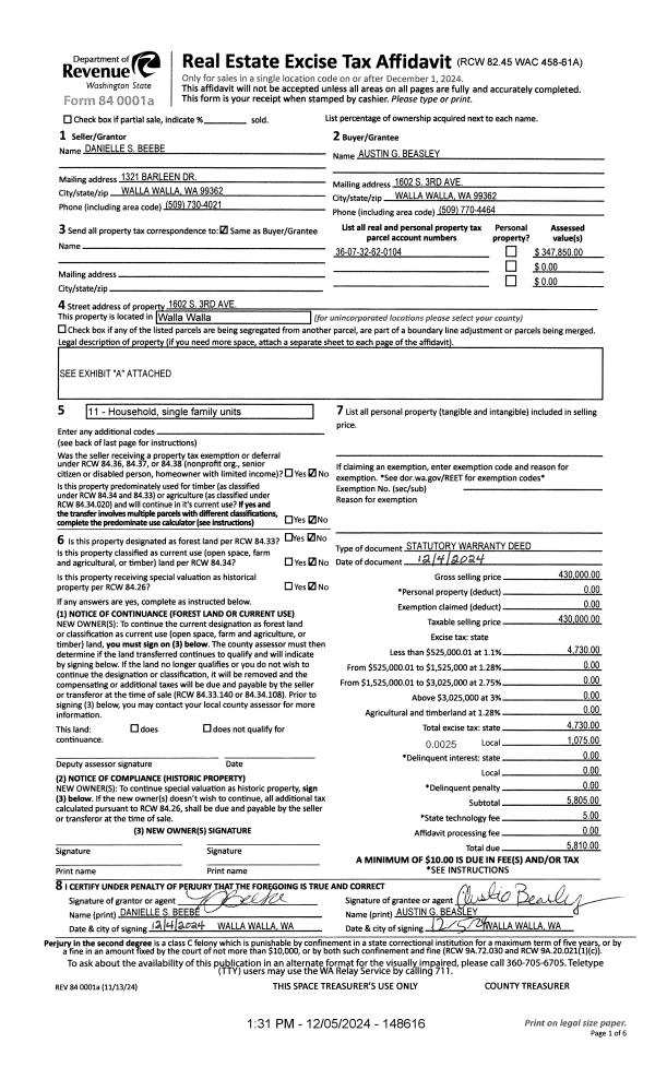 | 1 | 12/05/2024 | SWD | STATUTORY WARRANTY DEED | BEEBE DANIELLE S | BEASLEY AUSTIN G | | | $430,000.00 | 148616 | 2024-07020 |