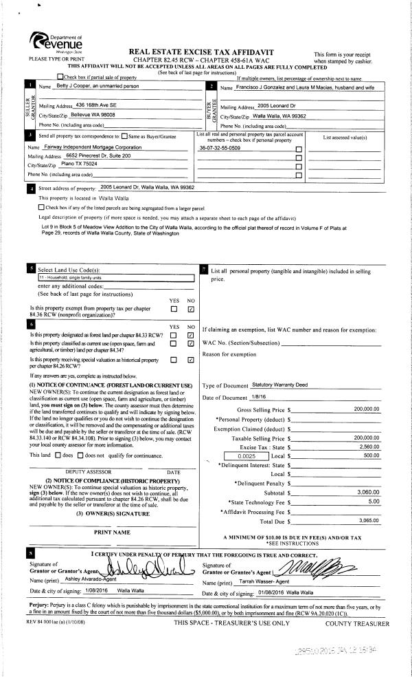 | 1 | 01/12/2016 | SWD | STATUTORY WARRANTY DEED | COOPER BETTY J | GONZALEZ FRANCISCO J | | | $200,000.00 | 129510 | 2016-00263 |