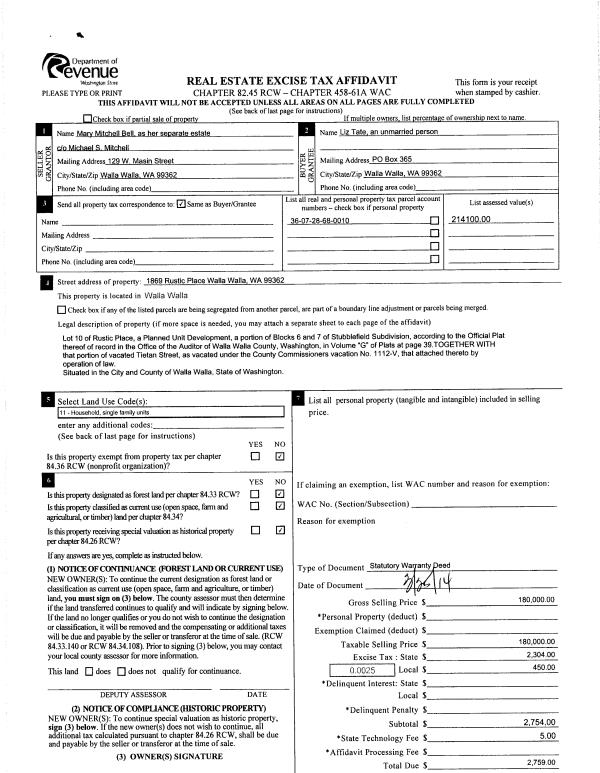 | 4 | 03/25/2014 | SWD | STATUTORY WARRANTY DEED | BELL MARY MITCHELL | TATE LIZ | | | $180,000.00 | 125614 | 2014-02018 |