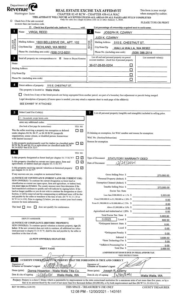 | 1 | 12/30/2021 | SWD | STATUTORY WARRANTY DEED | REED VIRGIL LEROY | CZARNY JOSEPH R & JUDI K | | | $273,000.00 | 143161 | 2021-15175 |