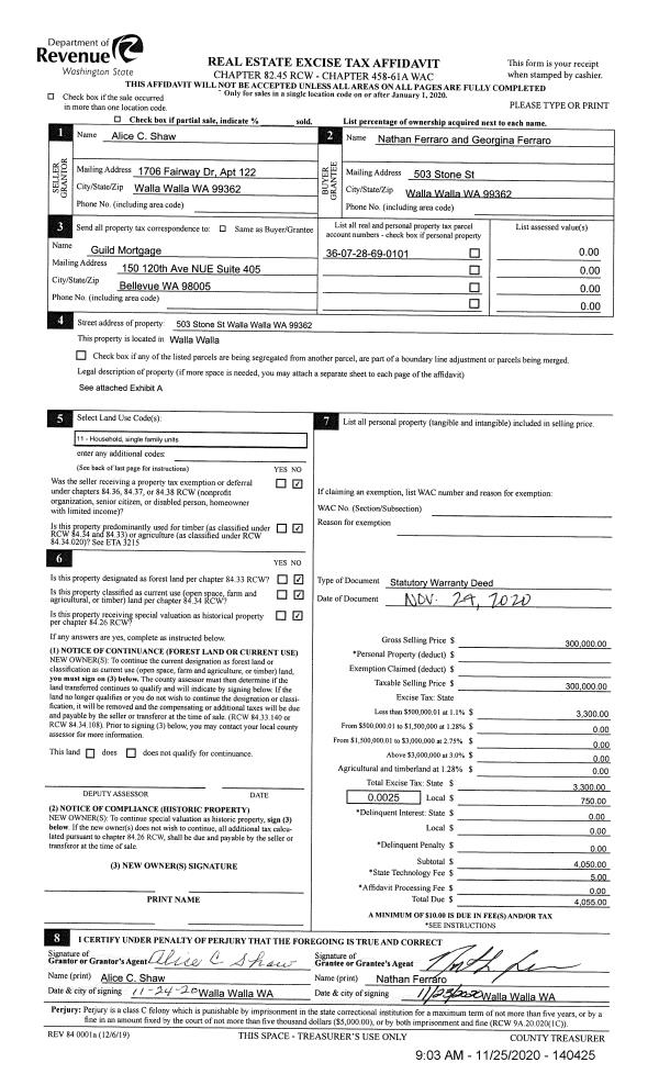 | 1 | 11/25/2020 | SWD | STATUTORY WARRANTY DEED | SHAW ALICE C | FERRARO NATHAN & GEORGINA | | | $300,000.00 | 140425 | 2020-12500 |
