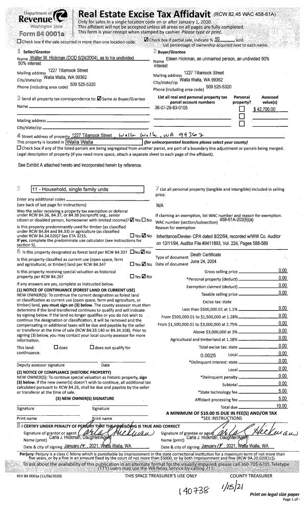 | 1 | 11/27/2020 | DEATH CERT | DEATH CERTIFICATE | HICKMAN EILEEN WILHEMINA ESTATE | HICKMAN CARLA | | | $0.00 | 140741 | 2021-00611 |