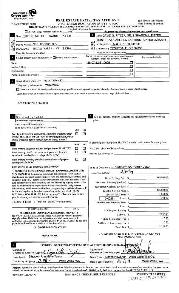 | 1 | 02/15/2019 | SWD | STATUTORY WARRANTY DEED | PURDY EDWARD J ESTATE OF | PITZER DAVID G SR & SHARON L | | | $145,000.00 | 136393 | 2019-00992 |