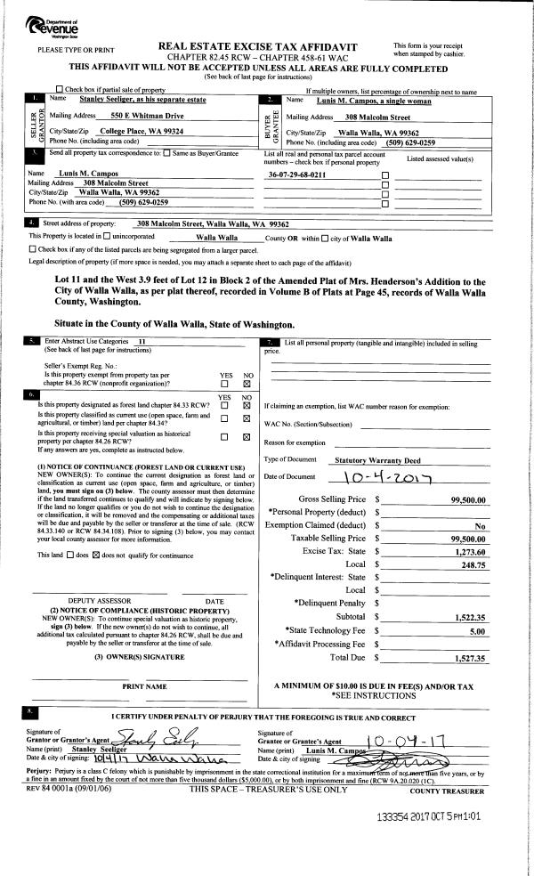 | 1 | 10/05/2017 | SWD | STATUTORY WARRANTY DEED | SEELIGER STANLEY | CAMPOS LUNIS M | | | $99,500.00 | 133354 | 2017-07921 |
