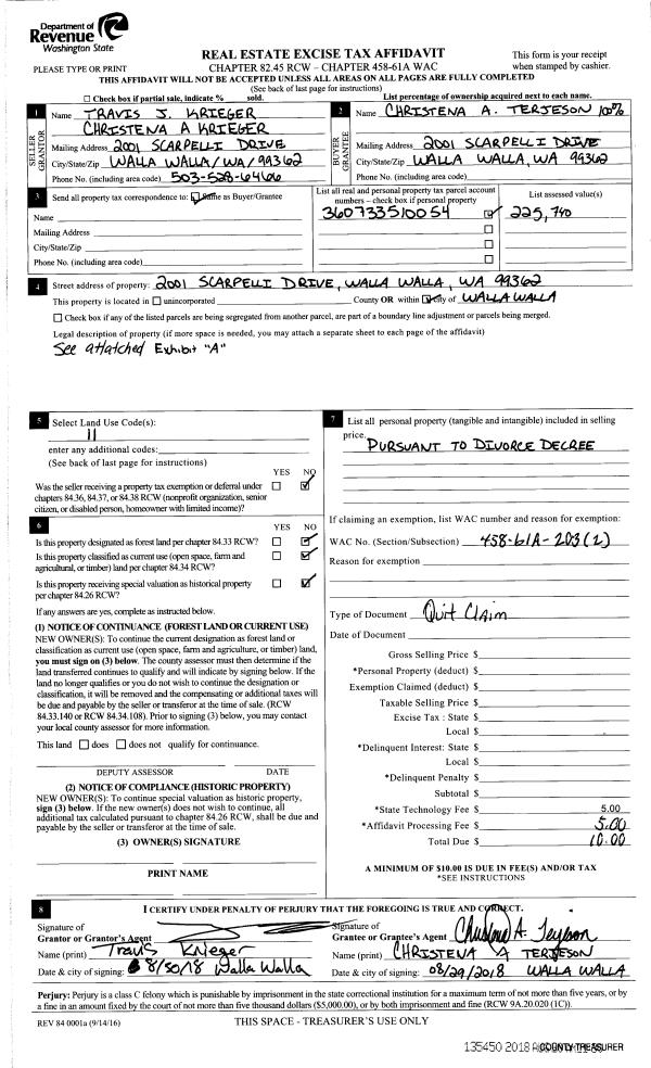 | 1 | 08/30/2018 | QCD | QUIT CLAIM DEED | KRIEGER TRAVIS J & CHRISTENA A | TERJESON CHRISTENA ADRIANNE | | | $0.00 | 135450 | 2018-07200 |