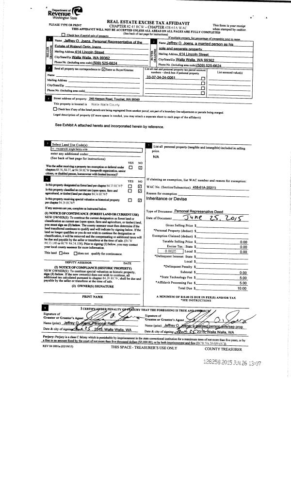 | 3 | 06/25/2015 | DPR | DEED OF PERSONAL REPRESENTATIVE | JOENS ROLAND O | JOENS JEFFREY O | | | $0.00 | 128258 | 2015-05448 |