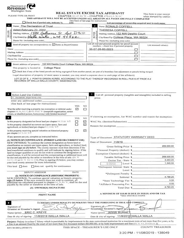 | 5 | 11/08/2019 | SWD | STATUTORY WARRANTY DEED | KREYE ERIC C & ARBUTIS TRUST | COFFELL RONALD & THERESA | | | $269,000.00 | 138049 | 2019-09207 |