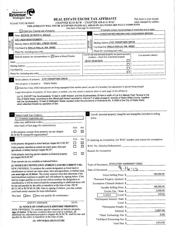 | 1 | 09/17/2015 | SWD | STATUTORY WARRANTY DEED | MAULE RUTH C ESTATE OF | BROWN CHRISTOPHER & CASSANDRA | | | $190,000.00 | 128839 | 2015-08155 |