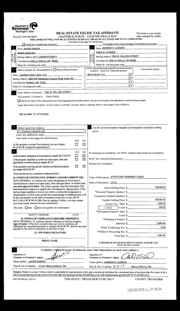 | 4 | 07/07/2015 | SWD | STATUTORY WARRANTY DEED | GARCIA JAVIER | CORDER ANDREW N & ANNA M | | | $128,000.00 | 128339 | 2015-05817 |