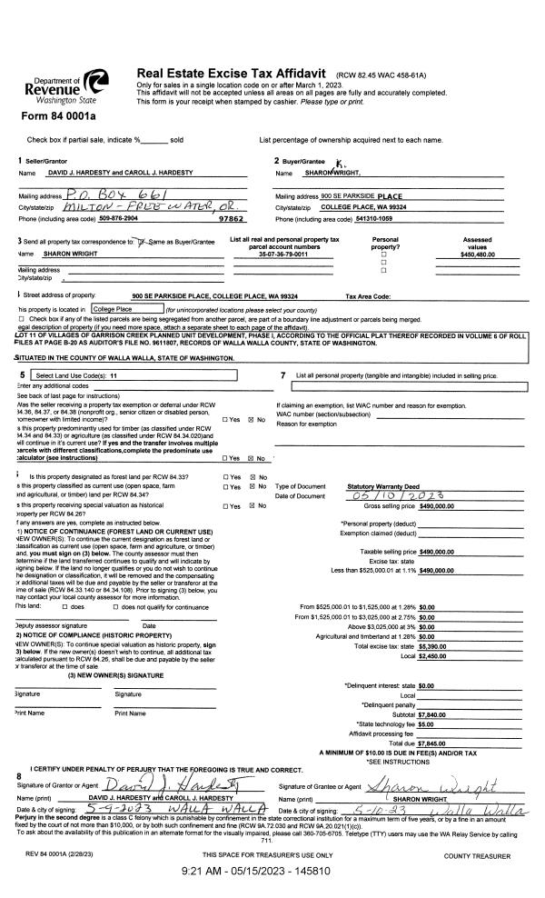 | 1 | 05/15/2023 | SWD | STATUTORY WARRANTY DEED | HARDESTY DAVID J & CAROLL J | WRIGHT SHARON K | | | $490,000.00 | 145810 | 2023-02564 |