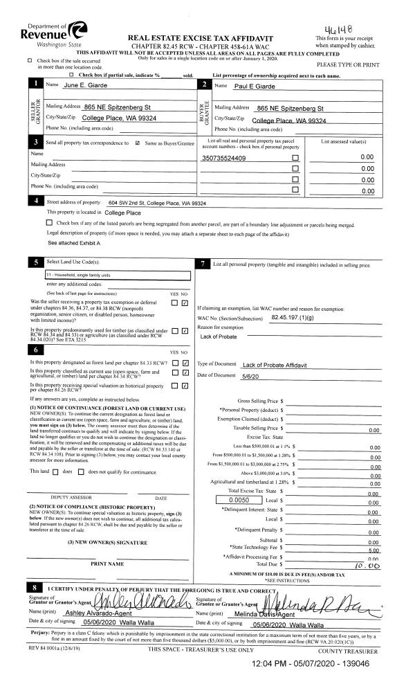 | 4 | 05/07/2020 | LOPA | LACK OF PROBATE AFFIDAVIT | GIARDE PAUL E | GIARDE PAUL E | | | | 139046 | 2020-03919 |