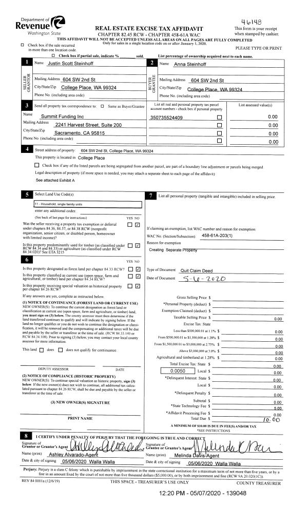 | 2 | 05/07/2020 | QCD | QUIT CLAIM DEED | STEINHOFF JUSTIN SCOTT | STEINHOFF ANNA | | | | 139048 | 2020-03921 |