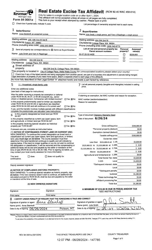 | 1 | 06/28/2024 | SWD | STATUTORY WARRANTY DEED | STEINHOFF ANNA | SMITH JULIE | | | $330,000.00 | 147785 | 2024-03464 |