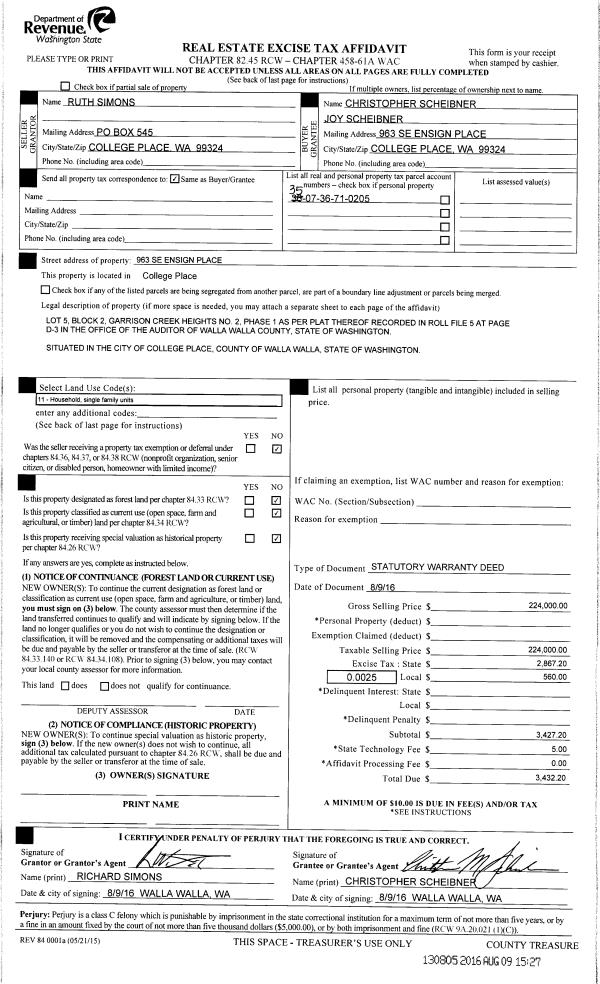 | 1 | 08/09/2016 | SWD | STATUTORY WARRANTY DEED | SIMONS RUTH | SCHEIBNER CHRISTOPHER & JOY | | | $224,000.00 | 130805 | 2016-06364 |
