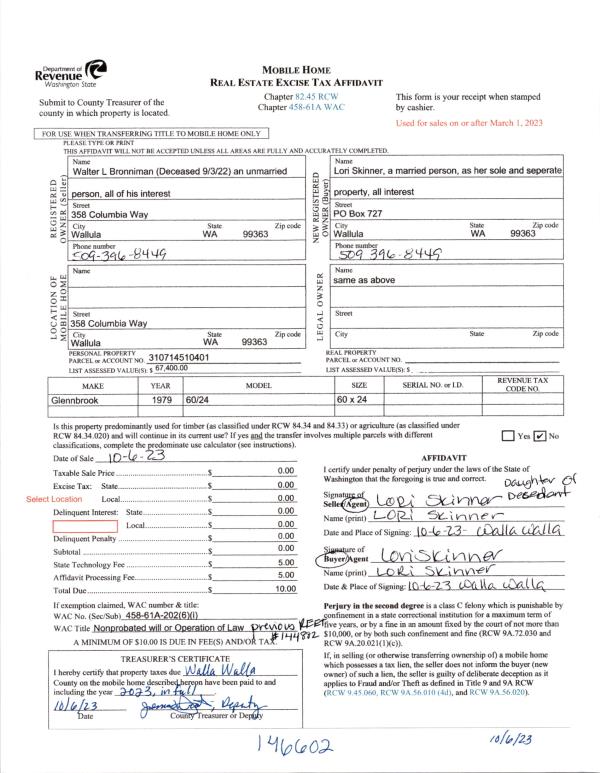 | 6 | 10/06/2023 | MH AFFIDAV | MOBILE HOME AFFIDAVIT | BRONNIMAN WALTER L ESTATE OF | SKINNER LORI D | | | | 146602 | MHAFF-146602 |