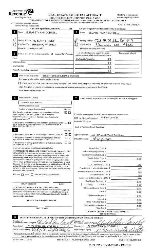 | 2 | 08/31/2020 | AFFIDAVIT | AFFIDAVIT | CORRELL ELIZABETH ANN | CORRELL ELIZABETH ANN | | | | 139819 | 2020-08793 |