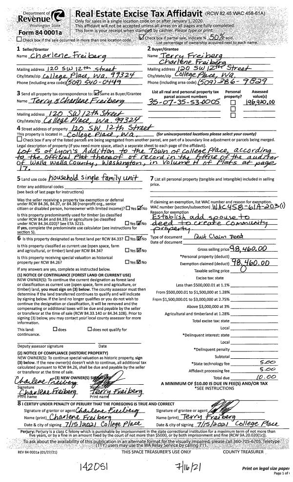 | 1 | 07/15/2021 | QCD | QUIT CLAIM DEED | FREIBERG CHARLENE | FREIBERG TERRY & CHARLENE | | | $0.00 | 142051 | 2021-08655 |