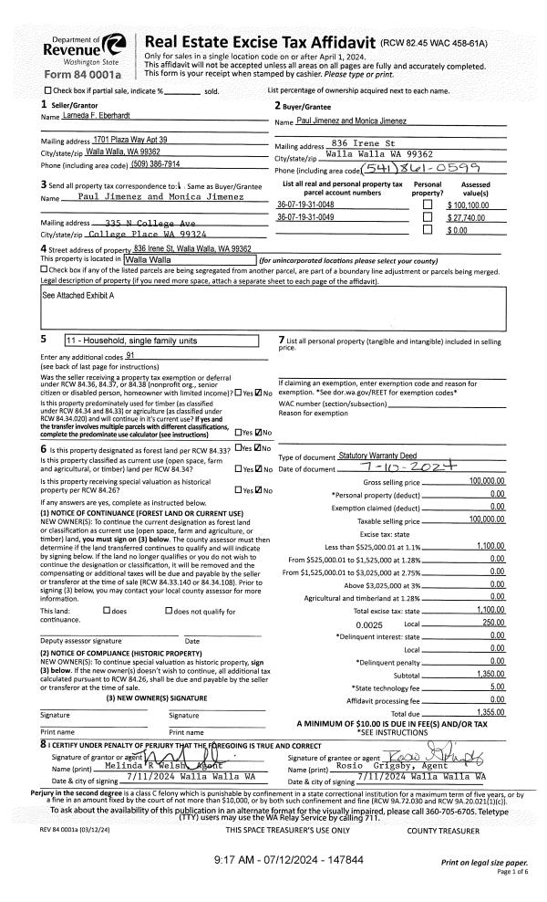 | 1 | 07/12/2024 | SWD | STATUTORY WARRANTY DEED | EBERHARDT LARNEDA F | JIMENEZ PAUL & MONICA | | 2-PARCELS | $100,000.00 | 147844 | 2024-03748 |