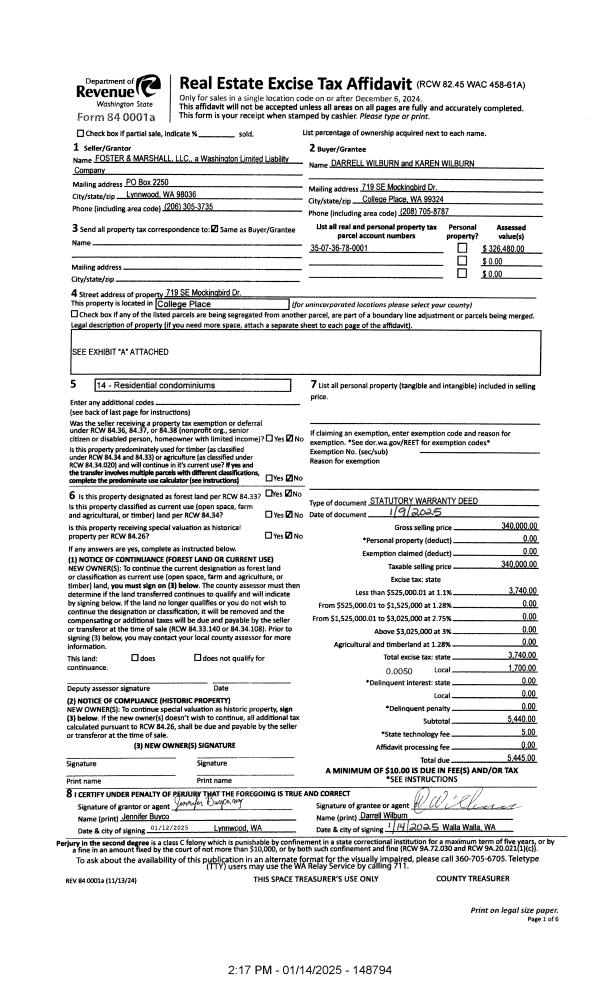 | 1 | 01/14/2025 | SWD | STATUTORY WARRANTY DEED | FOSTER & MARSHALL LLC | WILBURN DARRELL & KAREN | | | $340,000.00 | 148794 | 2025-00214 |
