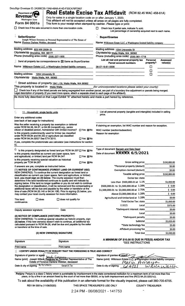 | 2 | 06/08/2021 | SWD | STATUTORY WARRANTY DEED | WEBBER DARLENE | WILKINSON ESTATE LLC | | | $150,000.00 | 141753 | 2021-06964 |