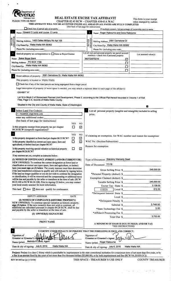 | 1 | 07/06/2016 | SWD | STATUTORY WARRANTY DEED | LENTZ HOWARD O & LOUISE | RABOURNE ROGER & DANA | | | $245,000.00 | 130560 | 2016-05204 |