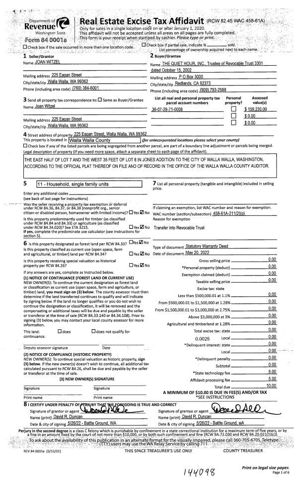 | 1 | 06/06/2022 | SWD | STATUTORY WARRANTY DEED | WITZEL JO AN | THE QUIET HOUR INC | | | $0.00 | 144098 | 2022-04827 |