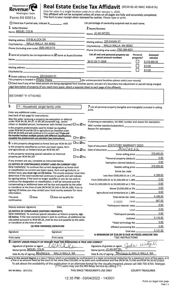 | 2 | 03/04/2022 | SWD | STATUTORY WARRANTY DEED | COLIN MIGUEL | WITZEL JO AN | | | $379,000.00 | 143501 | 2022-01891 |