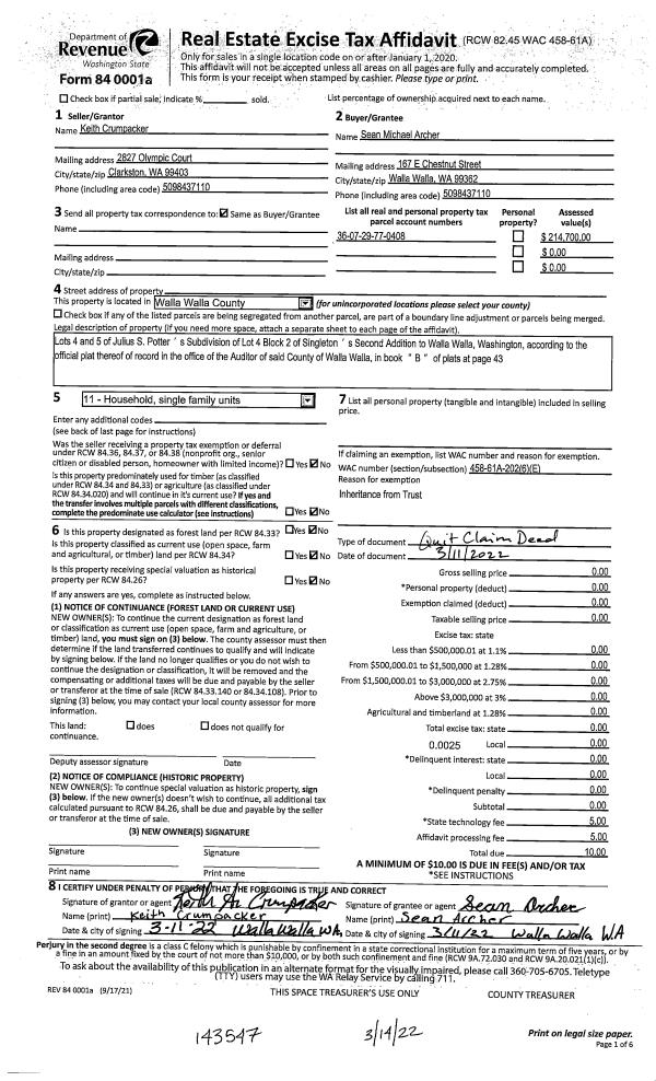 | 1 | 03/11/2022 | QCD | QUIT CLAIM DEED | BRADLEY FRIEDA FAMILY TRUST | ARCHER SEAN MICHAEL | | | $0.00 | 143547 | 2022-02142 |
