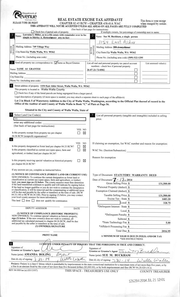| 2 | 07/21/2014 | SWD | STATUTORY WARRANTY DEED | MILLER LORRAINE I LIFE ESTATE | BUCKHAM SUE M | | | $131,500.00 | 126284 | 2014-05070 |