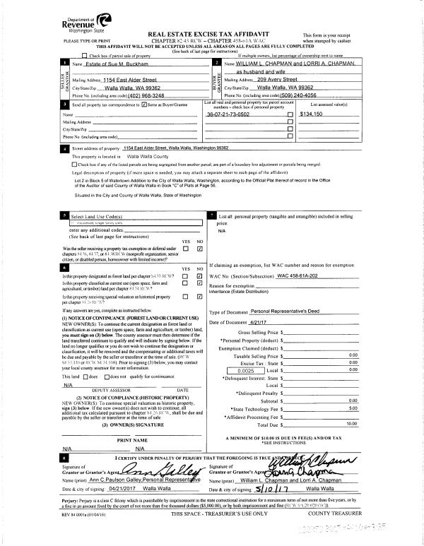 | 1 | 04/21/2017 | DPR | DEED OF PERSONAL REPRESENTATIVE | BUCKHAM SUE M | CHAPMAN WILLIAM & LORRI | | | $0.00 | 132353 | 2017-03524 |