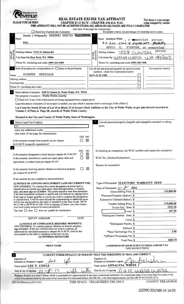 | 2 | 11/14/2012 | WARRANTY D | WARRANTY DEED | WILLIAMS, DONALD J & LOTTIE | WHITE, ANNALYSA | | | $119,000.00 | 122990 | 2012-10060 |