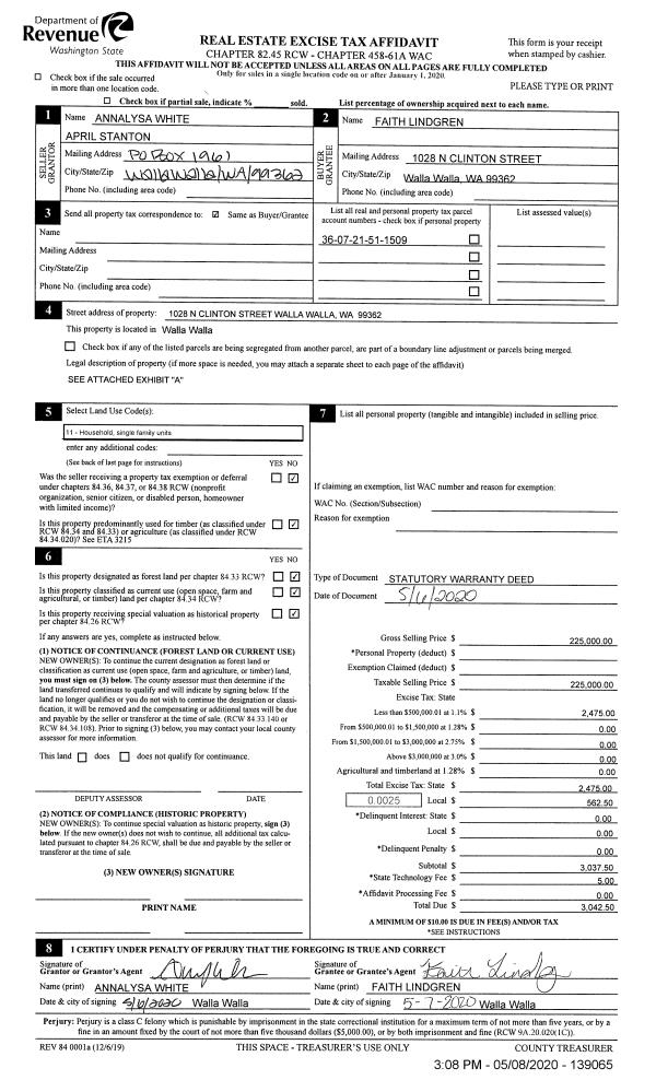 | 1 | 05/08/2020 | SWD | STATUTORY WARRANTY DEED | WHITE ANNALYSA | LINDGREN FAITH | | | $225,000.00 | 139065 | 2020-03976 |