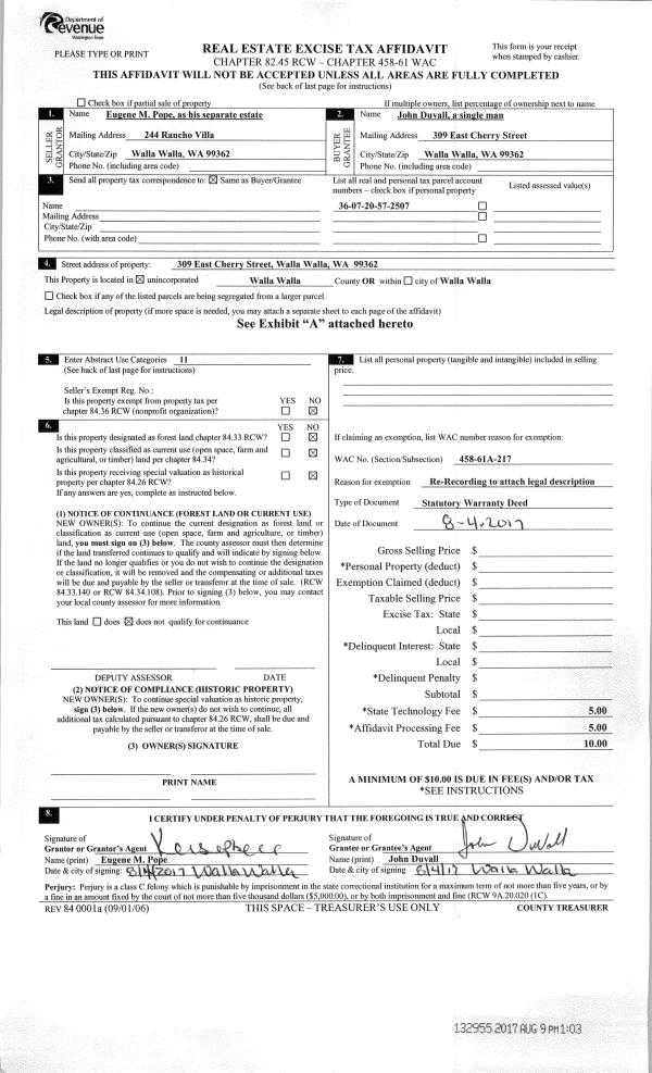 | 5 | 08/09/2017 | SWD | STATUTORY WARRANTY DEED | POPE EUGENE M | DUVALL JOHN | | | | 132955 | 2017-06115 |