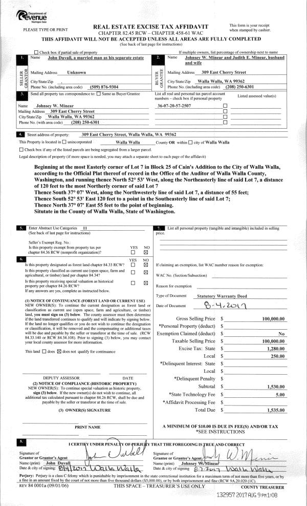 | 3 | 08/09/2017 | SWD | STATUTORY WARRANTY DEED | DUVALL JOHN | MINEAR JOHNSEY W & JUDITH E | | | $100,000.00 | 132957 | 2017-06117 |