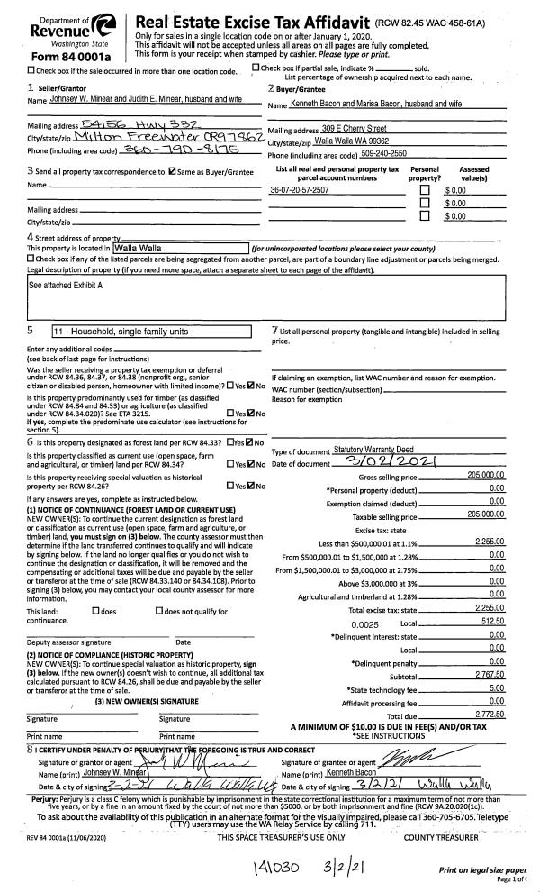 | 2 | 03/02/2021 | SWD | STATUTORY WARRANTY DEED | MINEAR JOHNSEY W & JUDITH E | BACON KENNETH & MARISA | | | $205,000.00 | 141030 | 2021-02430 |