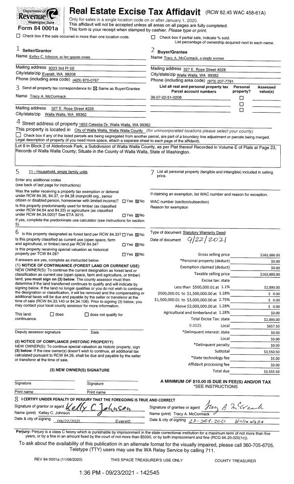 | 3 | 09/23/2021 | SWD | STATUTORY WARRANTY DEED | BRAUCHER CLIFFORD C ESTATE OF | MCCORMACK TRACY A | | | $263,000.00 | 142545 | 2021-11668 |