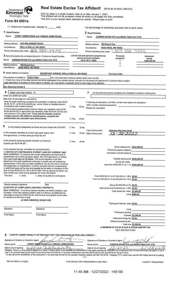 | 1 | 12/27/2022 | SWD | STATUTORY WARRANTY DEED | ARMSTRONG PERRY & TAMARA | DYE DARREN WYNN & MARILYNDA KAY | | | $240,000.00 | 145190 | 2022-09913 |