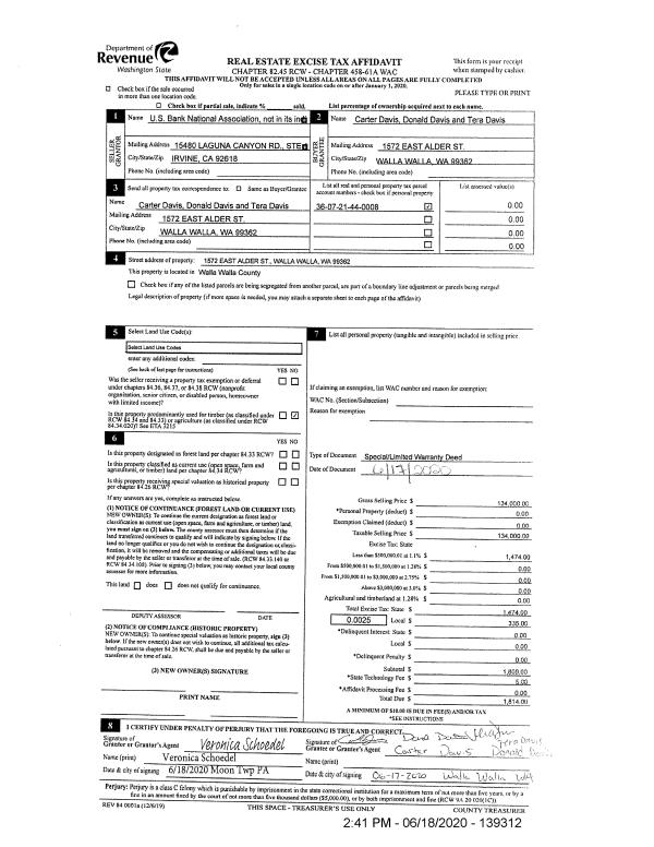 | Mailing Address: | DONALD DAVIS & TERA DAVIS 1572 E ALDER ST WALLA WALLA, WA 99362 | % Ownership: | 100.0000000000% |