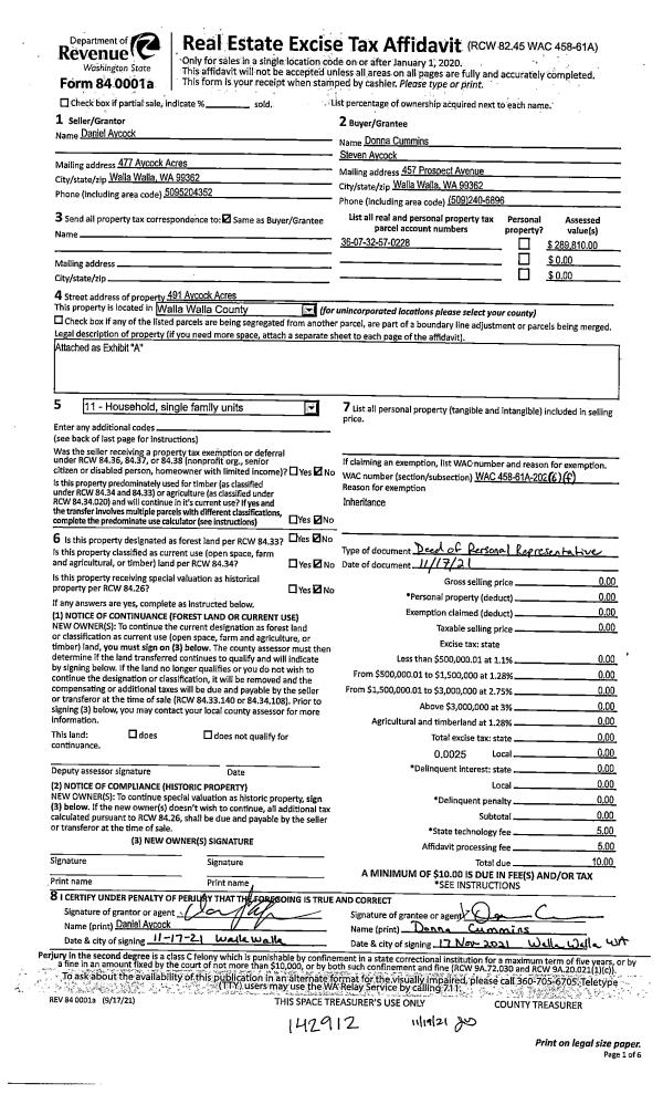 | 2 | 11/19/2021 | DPR | DEED OF PERSONAL REPRESENTATIVE | AYCOCK JACK T ESTATE OF | CUMMINS DONNA | | | $0.00 | 142912 | 2021-13794 |