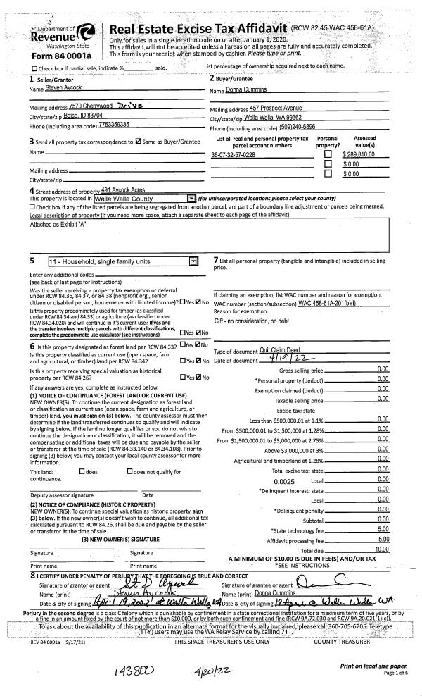 | 1 | 04/19/2022 | QCD | QUIT CLAIM DEED | CUMMINS DONNA | CUMMINS DONNA | | | $0.00 | 143800 | 2022-03365 |