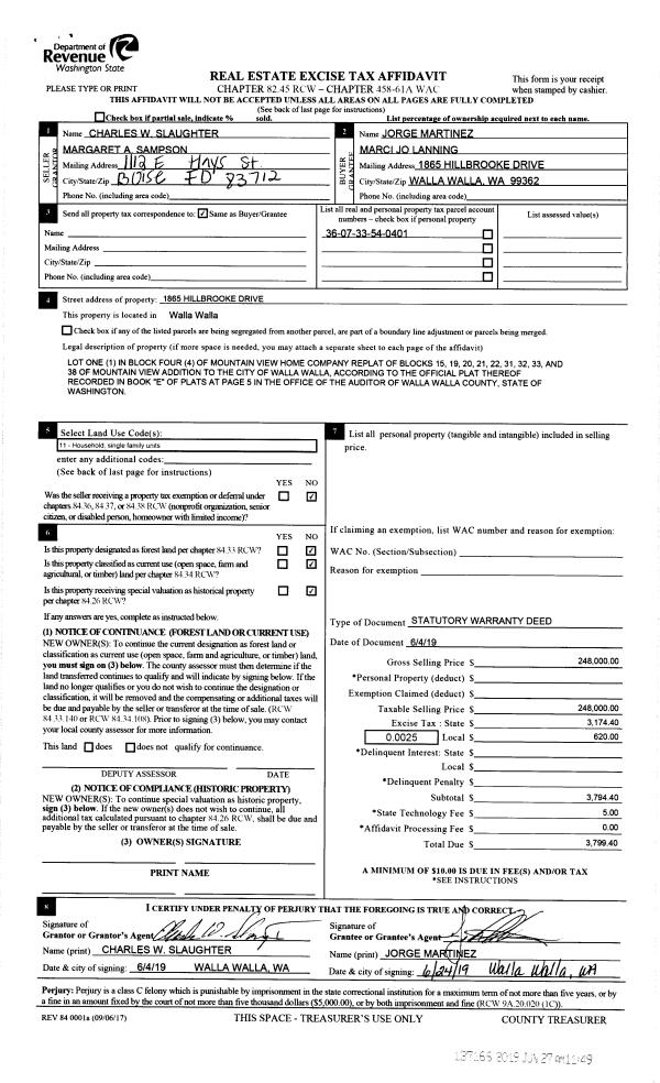 | 2 | 06/27/2019 | SWD | STATUTORY WARRANTY DEED | SLAUGHTER CHARLES WESLEY | MARTINEZ JORGE & MARCI JO LANNING | | | $248,000.00 | 137166 | 2019-04563 |