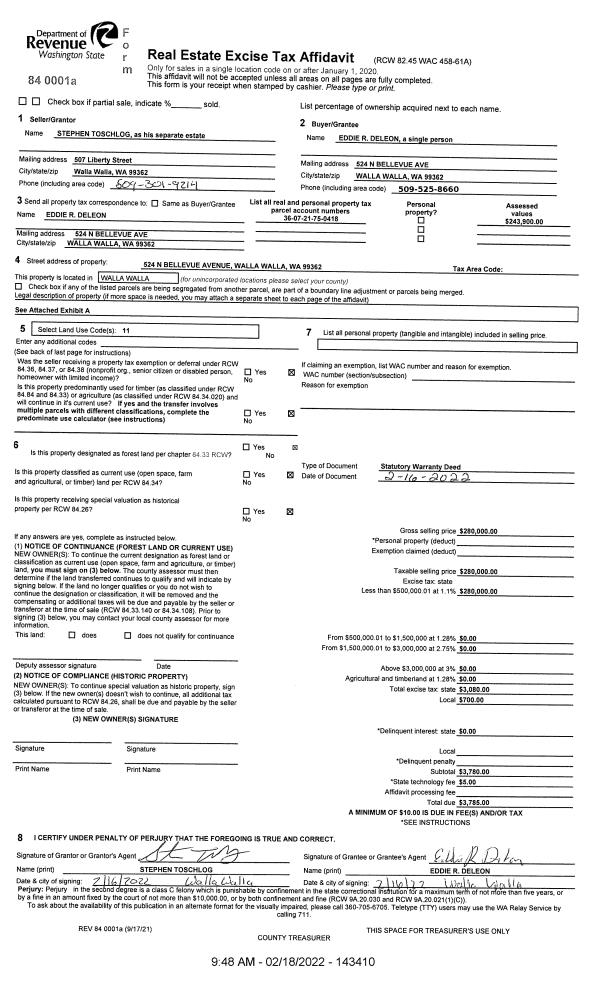 | 1 | 02/18/2022 | SWD | STATUTORY WARRANTY DEED | TOSCHLOG STEPHEN J | DELEON EDDIE R | | | $280,000.00 | 143410 | 2022-01475 |