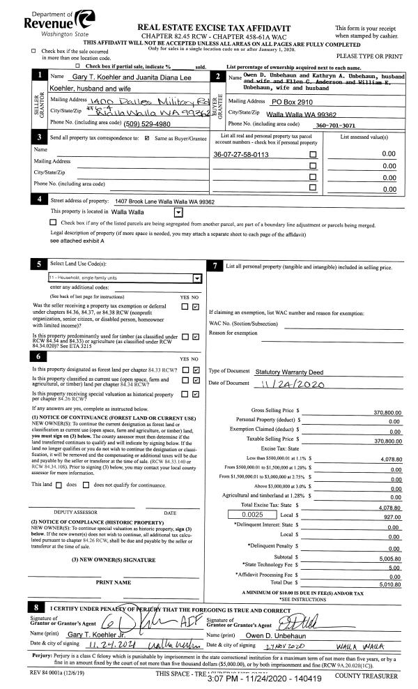 | 1 | 11/24/2020 | SWD | STATUTORY WARRANTY DEED | KOEHLER GARY T | UNBEHAUN OWEN D & KATHRYN A | | | $370,800.00 | 140419 | 2020-12463 |