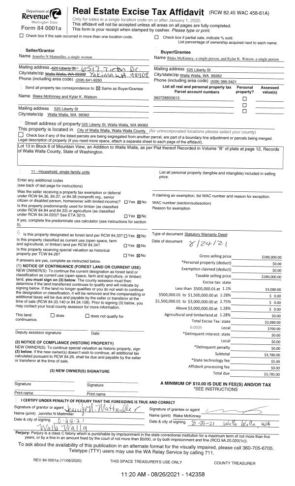 | 1 | 08/26/2021 | SWD | STATUTORY WARRANTY DEED | MATTMILLER JENNIFER N | MCKINNEY BLAKE | | | $280,000.00 | 142358 | 2021-10467 |
