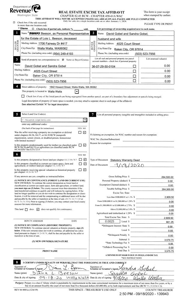 | 3 | 09/18/2020 | SWD | STATUTORY WARRANTY DEED | BEESON LOIS L ESTATE OF | GOBEL DAVID & SANDRA | | | $264,500.00 | 139943 | 2020-09588 |