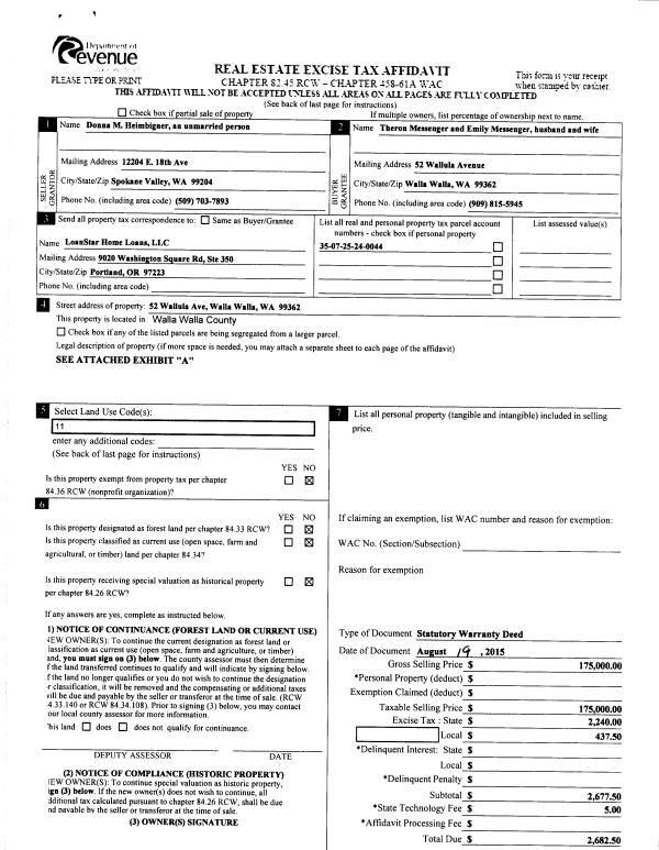 | 2 | 09/02/2015 | SWD | STATUTORY WARRANTY DEED | HEIMBIGNER DONNA MARIE | MESSENGER THERON & EMILY | | | $175,000.00 | 128756 | 2015-07763 |