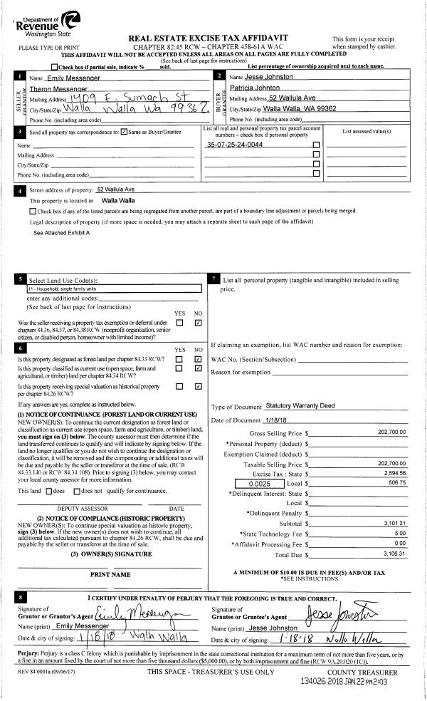 | 1 | 01/22/2018 | SWD | STATUTORY WARRANTY DEED | MESSENGER THERON & EMILY | JOHNSTON JESSE & PATRICIA | | | $202,700.00 | 134026 | 2018-00610 |